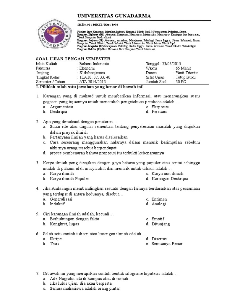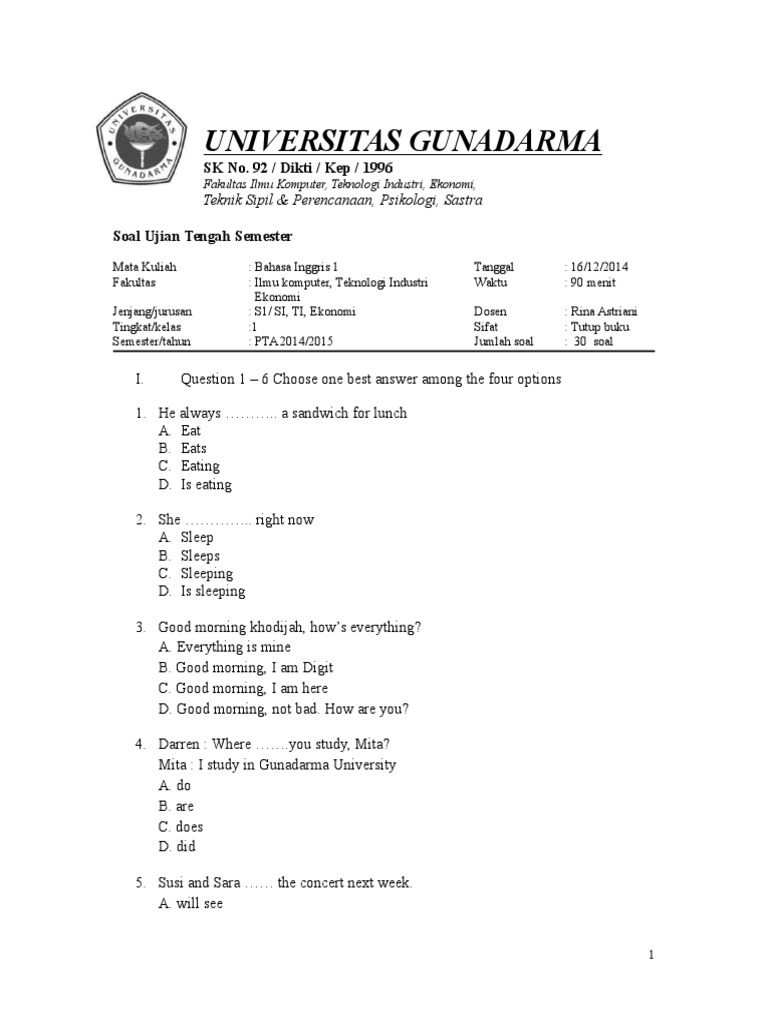 Soal Dan Jawaban Uts Bahasa Inggris Semester Kuliah. Soal dan Jawaban PTIK 11 Pertemuan 1-6 Pertemuan 9-14 Manajemen Administrasi BSI Semester II Pertemuan 1 PTIK 11 1 Penerapan ilmu pengetahuan kombinasi teknik ilmiah dan material untuk memenuhi tujuan atau memecahkan. Beranda soal soal kuliah soal uts.