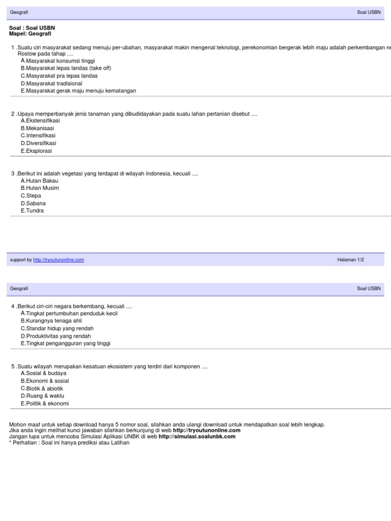 Download Pdf Soal Dan Kunci Jawaban Latihan Un Unbk Dan Usbn 2018 2019 Mata Pelajaran Geografi Utk Sma Prodi Ips Folder Soal Uan Snmptn Cpns. Tentunya bisa Anda jadikan referensi pembelajaran untuk menghadapi USBN Geografi tahun 2019 ini. SOAL PILIHAN GANDA 1.