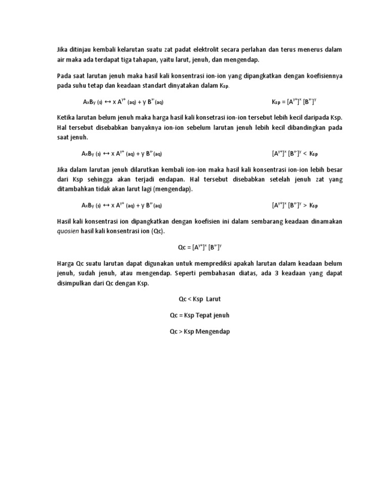 12 Dasar Teori 121 Larutan Larutan adalah Campuran homogen dari molekul. Dan sebaliknya jika hasil kali ion lebih kecil dari hasil kali kelarutan kesetimbangan dalam sistem dicapai kembali dengan melarutnya sebagian garam padat ke. Definisi hasil kali kelarutan adalah hasil kali konsentrasi ion ion dari larutan jenuh garam yang sukar larut dalam air dengan di pangkatkan koefisien menurut persamaan ionisasinya.